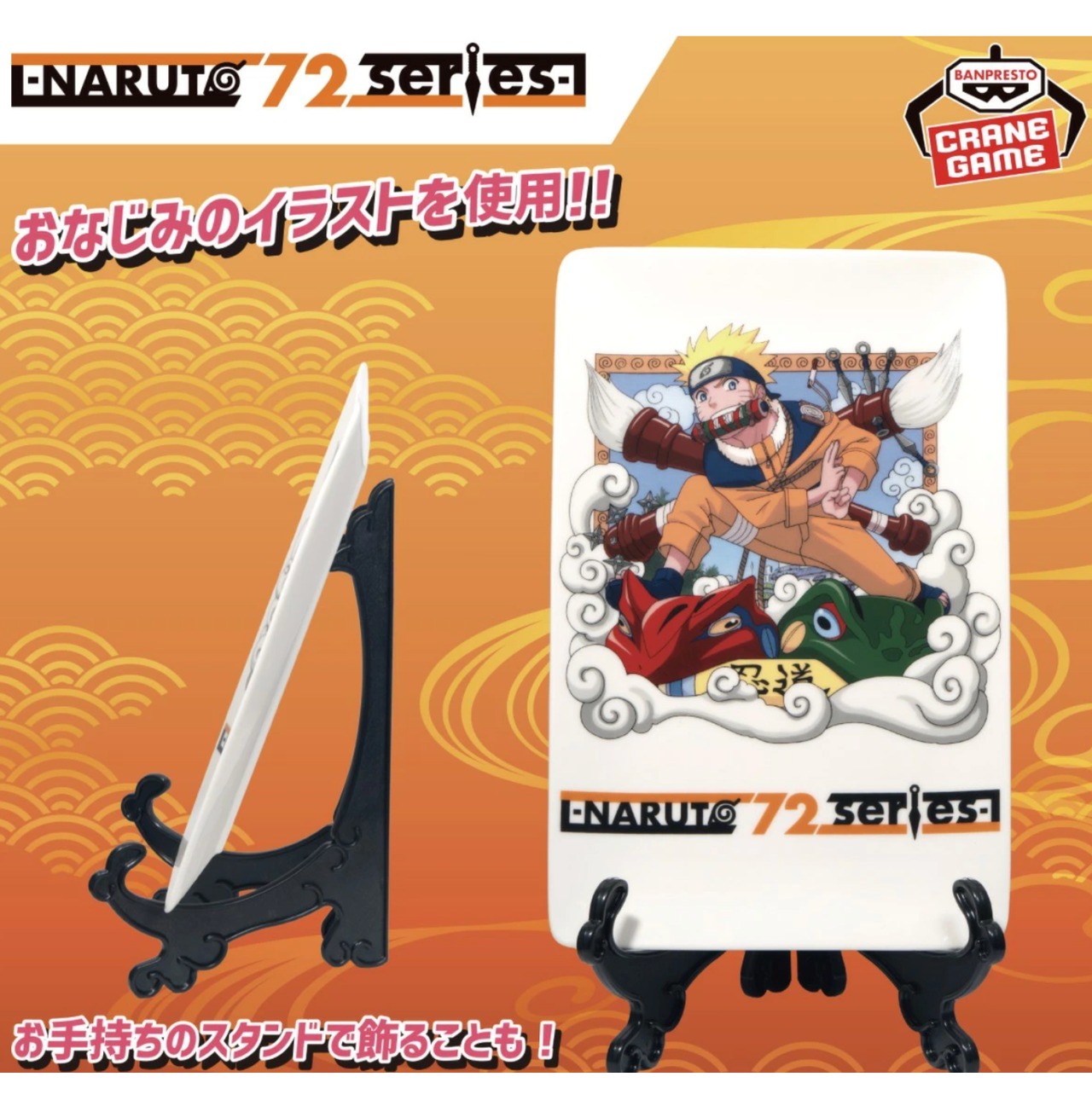 「NARUTO-ナルト-」のおなじみのイラストが続々展開される「-NARUTO 72 series-」より、陶磁器製プレートが堂々登場! 食器として使うことも出来ますが、お手持ちのスタンドで飾ることも出来ます。 商品仕様 ・全1種 ・約24cm