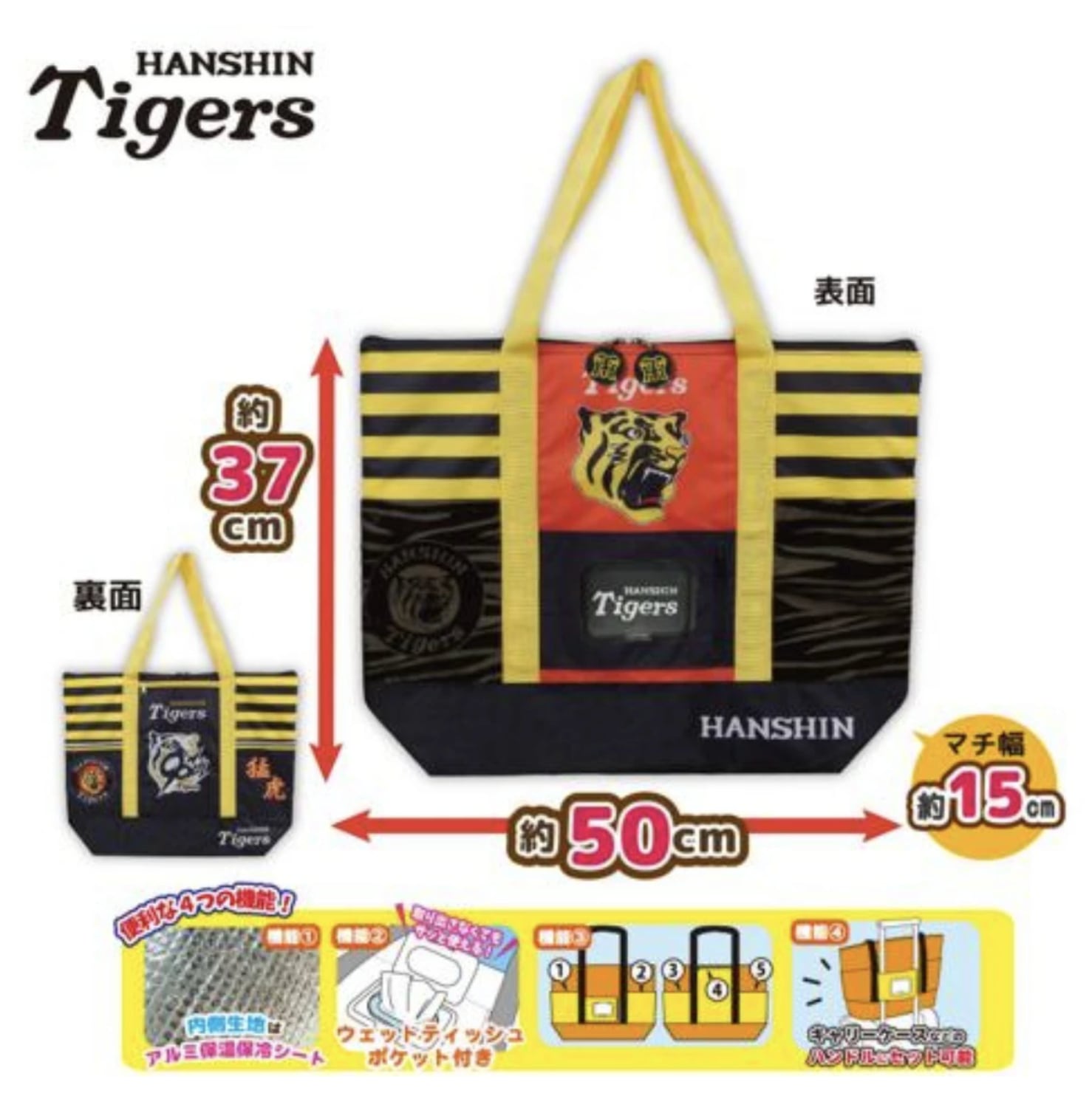阪神タイガース 保温保冷多機能BIGトートバッグ 四隅にペットボトルが入るくらいのポケット 表にはウェットティッシュを入れて使用できる蓋付き