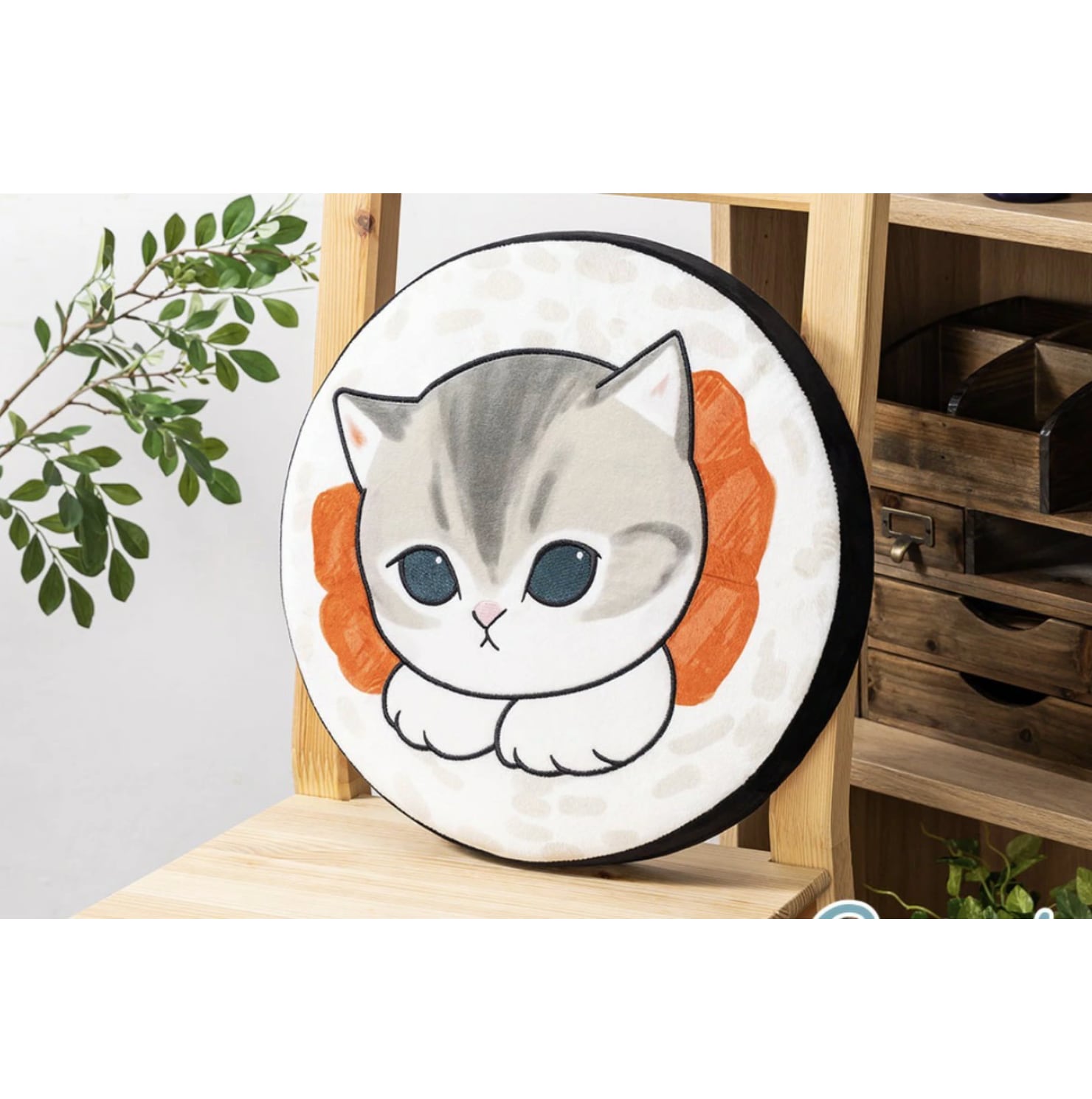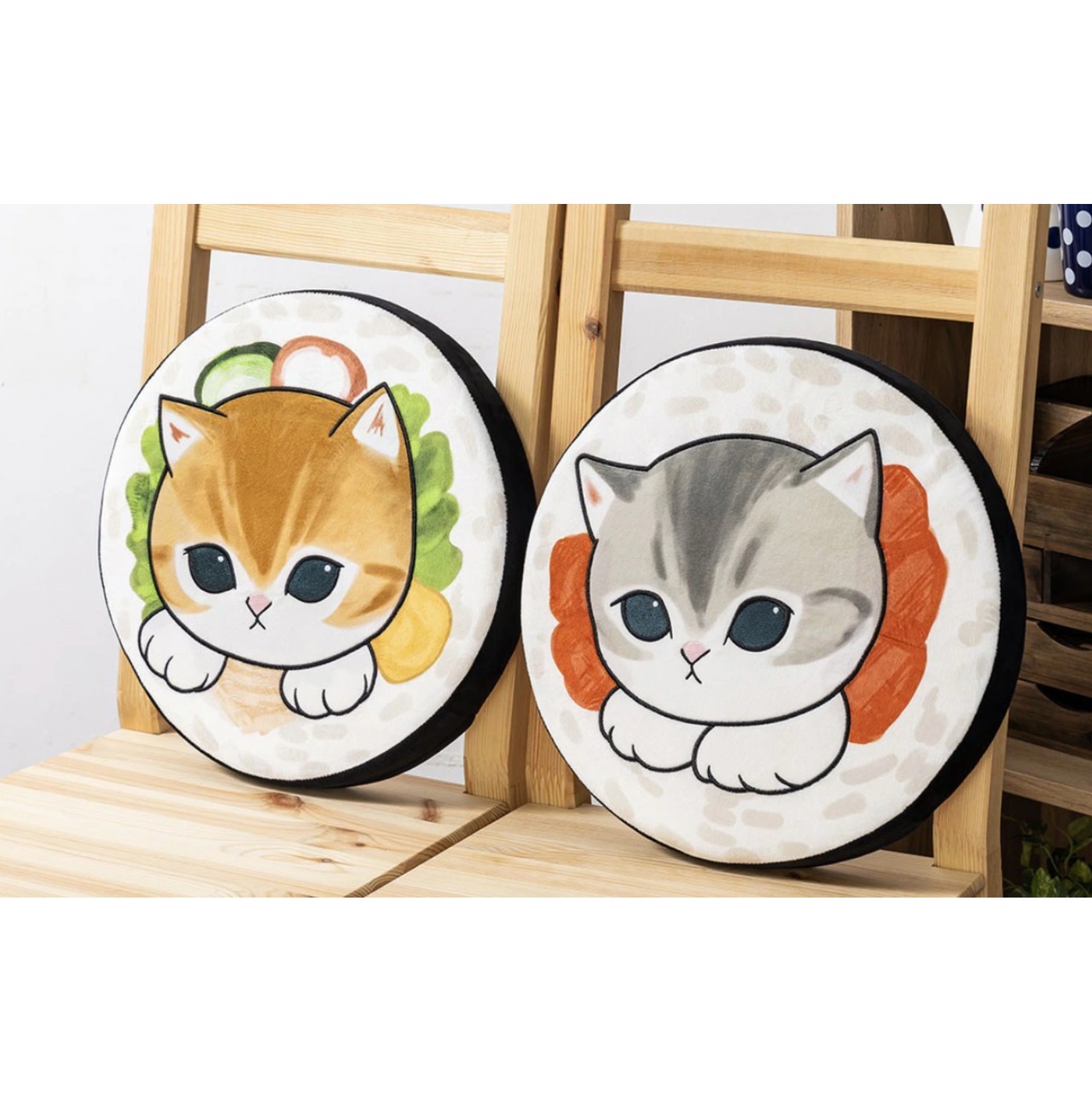にゃんこたちがお寿司の低反発クッションに フチも海苔のデザインでかわいい! 鉄火巻きと太巻きの全2種です 種類:全2種 サイズ:約W39cm